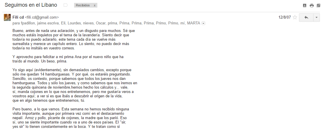 Ni todos los folletines del ministerio de defensa tranquilizan a una madre hormonada que, aunque en aquellos tiempos ya era vieja pelleja en estos lares (cuarta misión por entonces, ahora ya son muchas más), no podía dejar de preocuparse constantemente por la integridad del padre de su futuro hijo. Así pues, éste emprendió la tarea de narrarnos a mí y a varios familiares-amigos-allegados, sus vicisitudes para descubrirnos el auténtico espíritu de nuestras fuerzas armadas.
