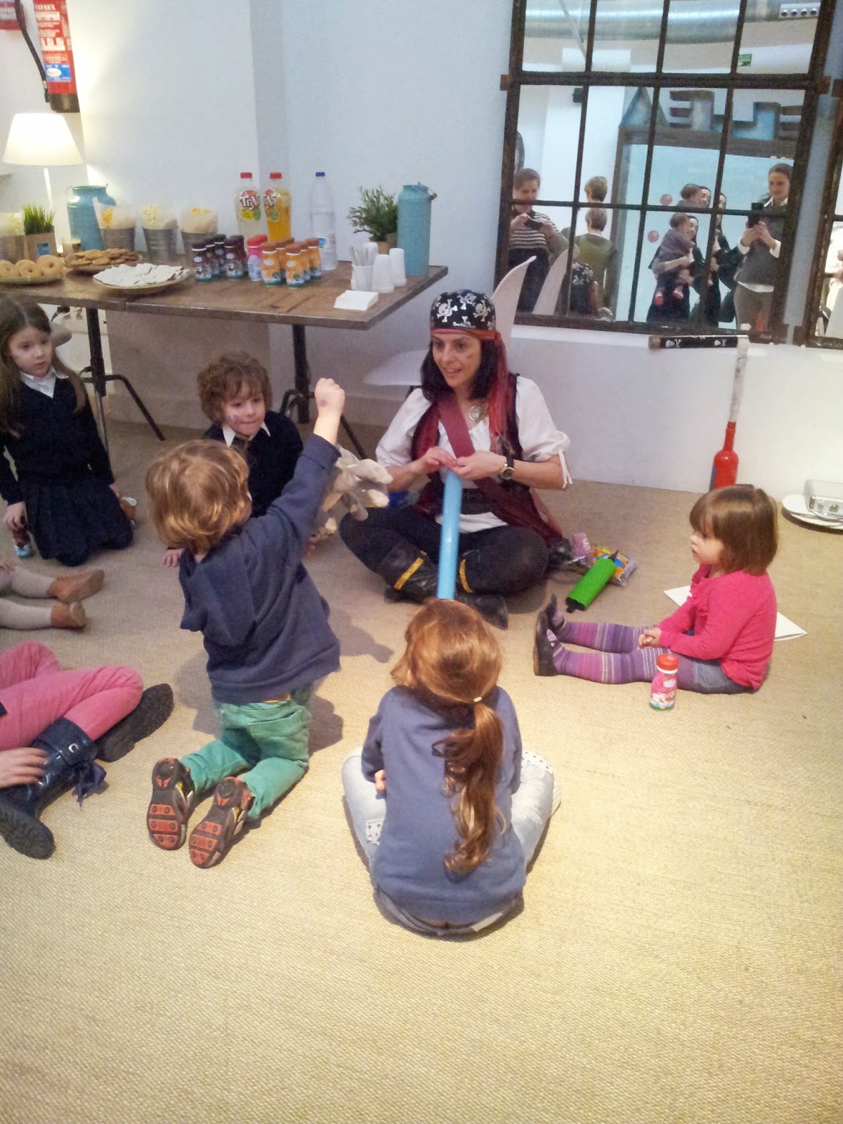 No faltó detalle, todo un despliegue para los niños con animadora pirata, merienda, chuches y mesas con lapices de colores y hojas; y para las mamás (y ese valiente papá), todo lo necesario para  una picaeta pre y post conferencia.