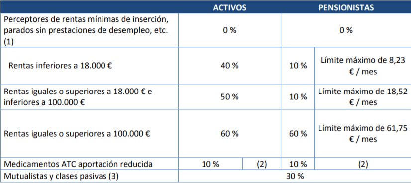 Cuadro de aportaciones por medicamentos a la seguridad social. Exención copago