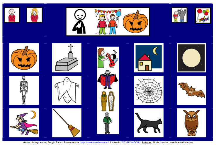 Tablero de comunicación con12 pictogramas sobre Halloween extraído de ARASAAC, que es el portal de referencia para comunicación aumentada.