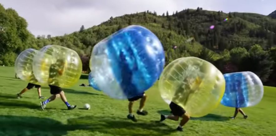 Niños en la vuelta al cole dentro de burbujas de plástico
