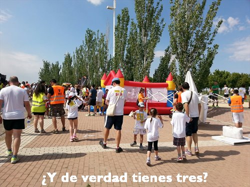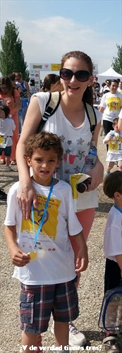Y el de 3, cuando vio la movida, me soltó la mano, apretó los puños y con todo el impulso del mundo se dedicó a dar las mejores de sus zancadas, súper concentrado. En ese momento, me dio la risa floja al verlo, hasta que, a tres metros de la línea de meta va y se para: «Ya no quiero más». Así que lo levanté, lo acerqué un poco y al jalearle se volvió a venir arriba y entró. Eso sí, no quiso saber nada de la medalla porque «ya tenía una de Tenis«. Tócate la flor.