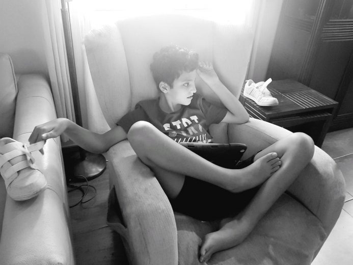 Rodrigo en cuarentena sentado en el sofá con la tablet y las zapatillas de deporte en la mano. Imagen en blanco y negro